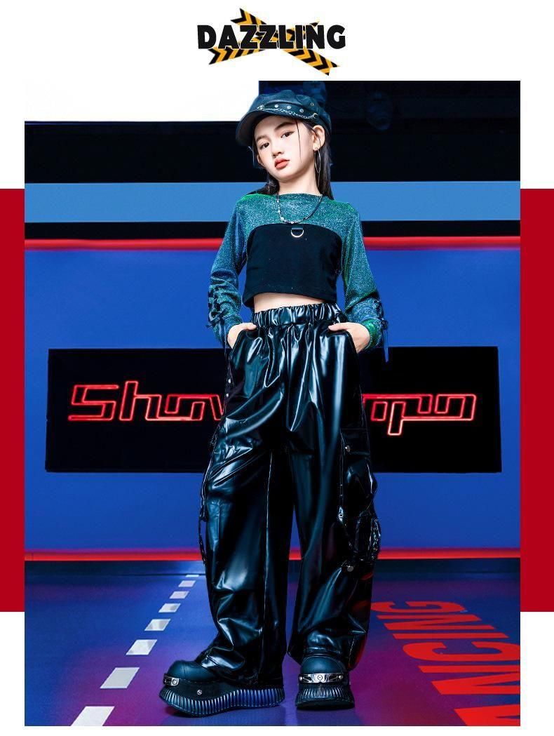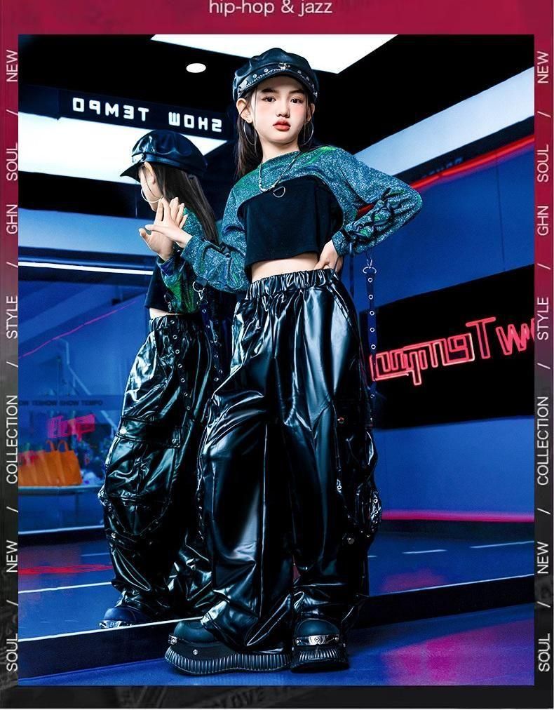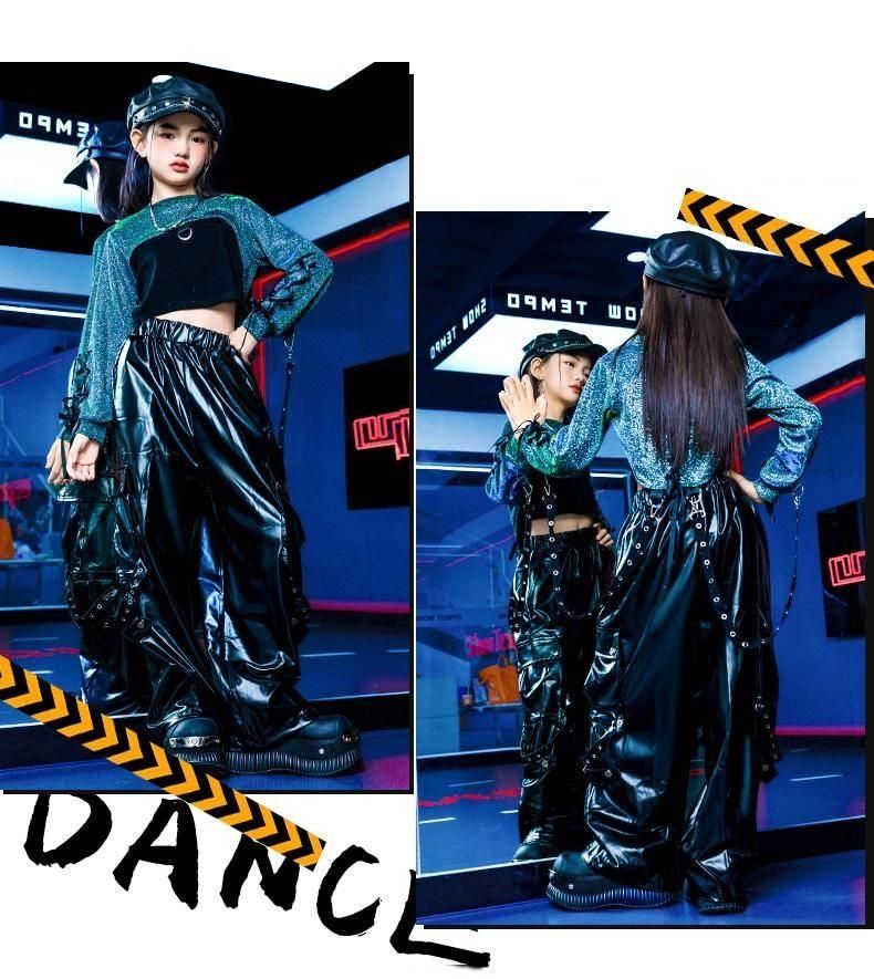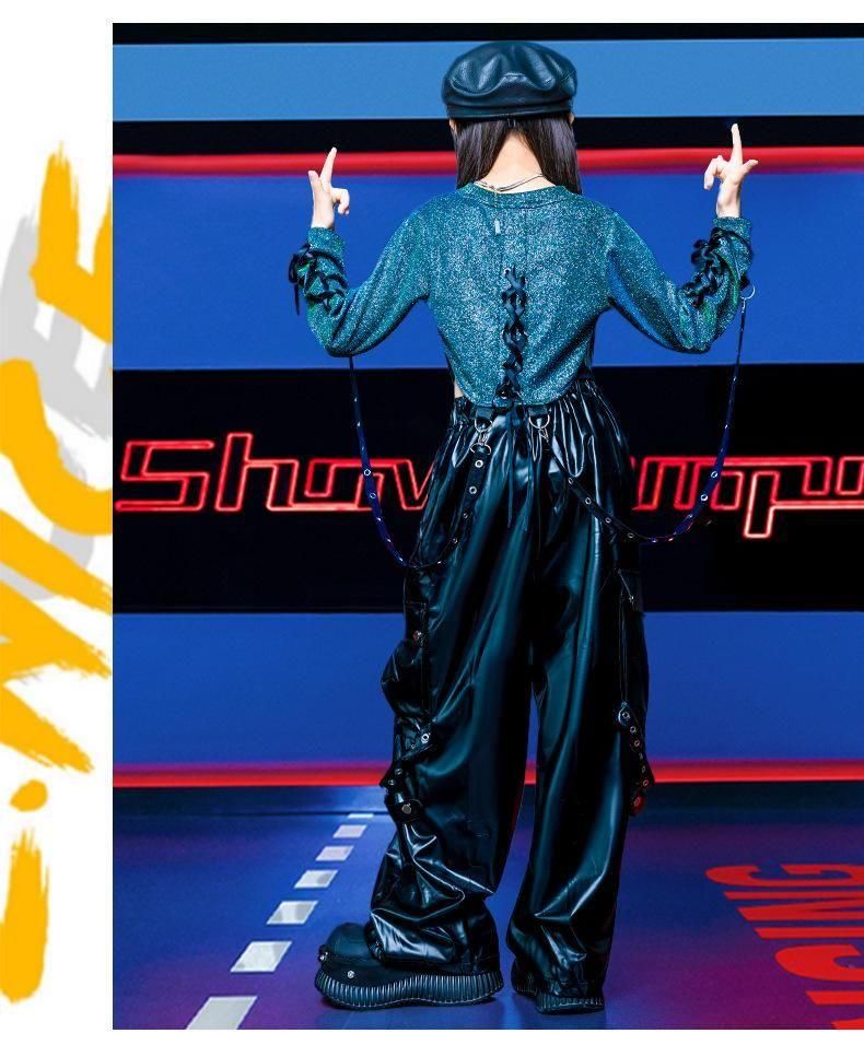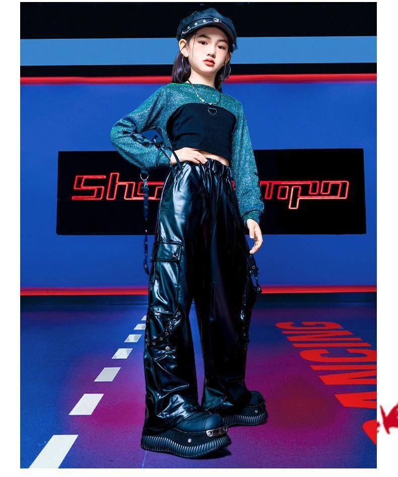 ・キラキララメトップス+レザー調パンツのクールかっこいいダンス衣装!