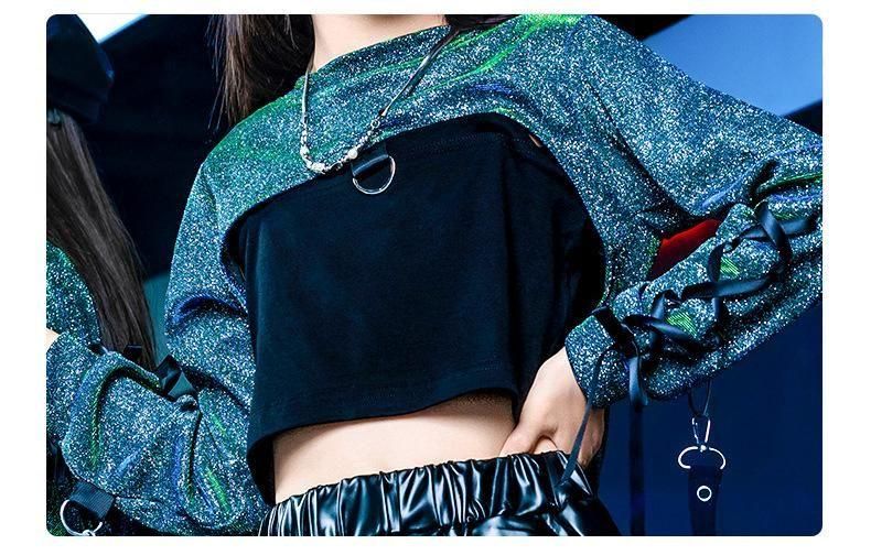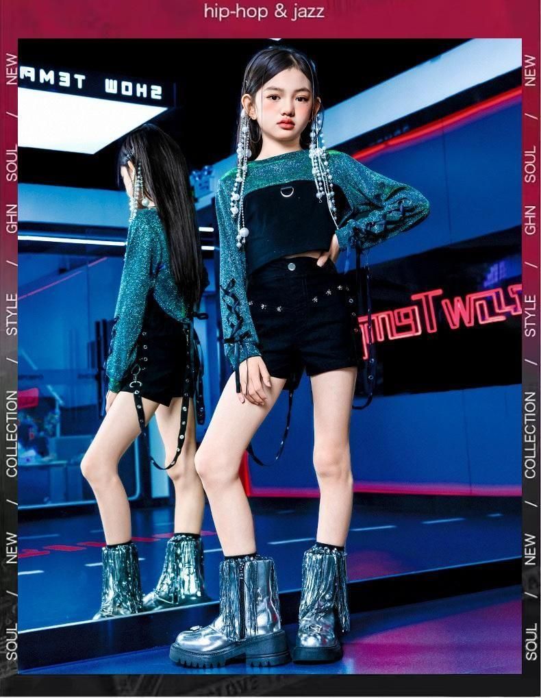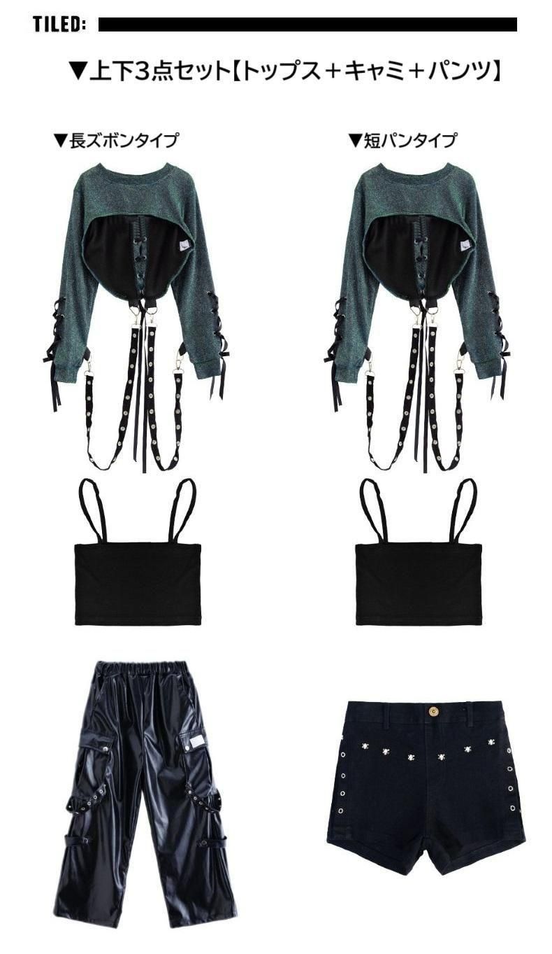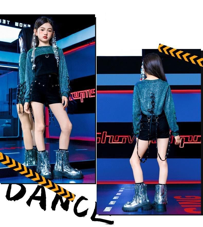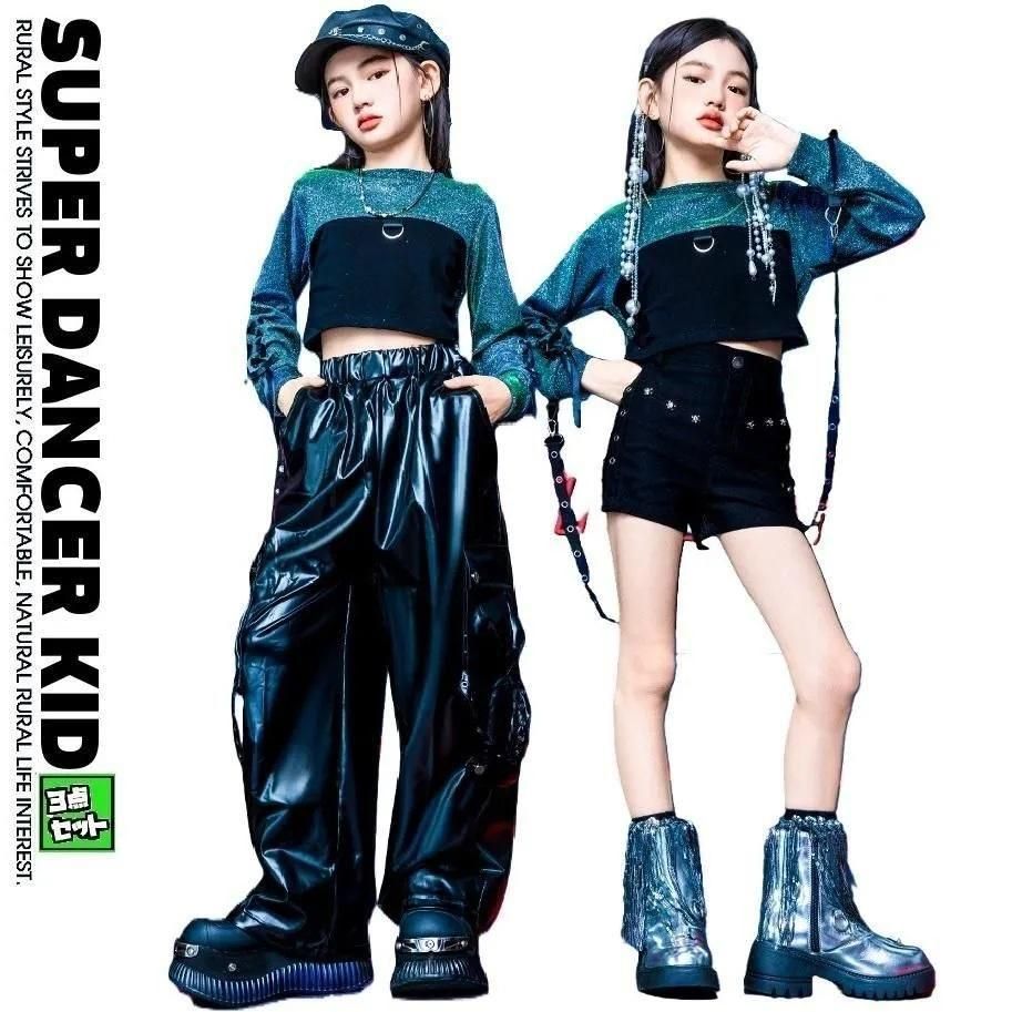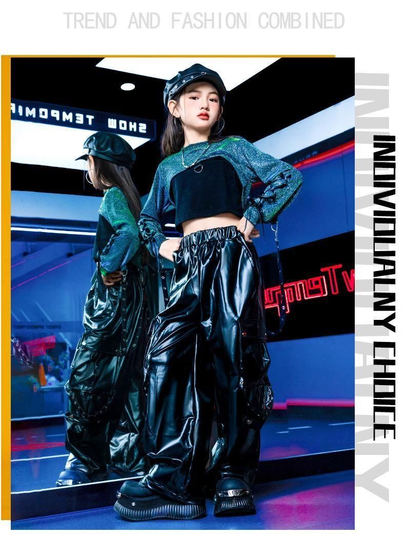 ・キラキララメトップス+レザー調パンツのクールかっこいいダンス衣装!