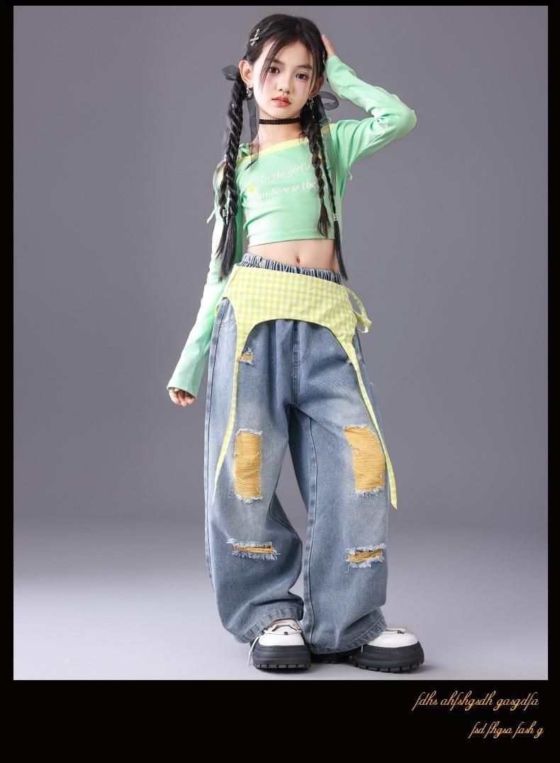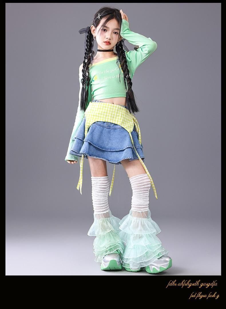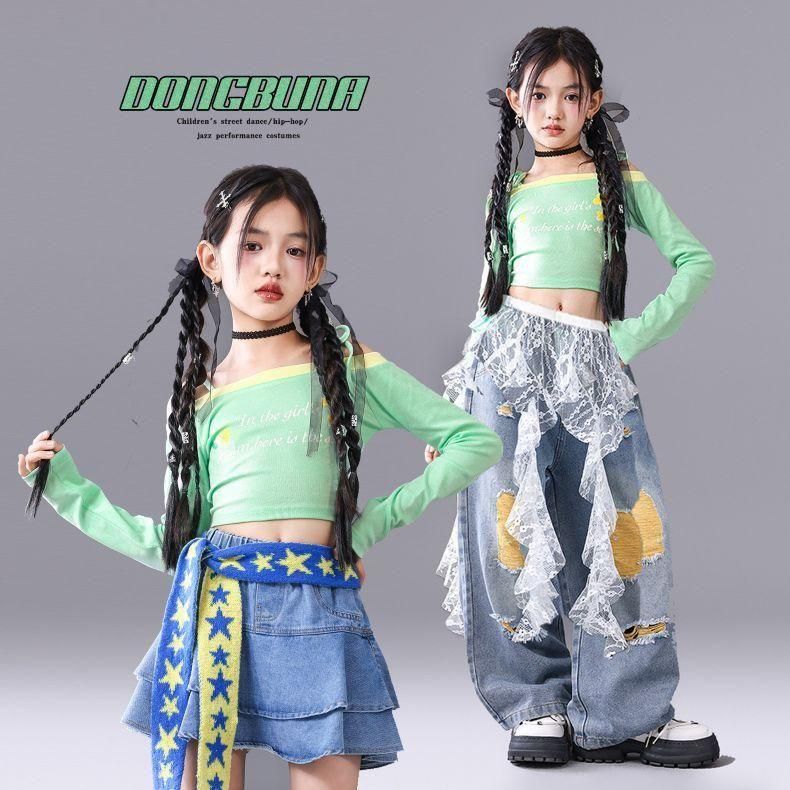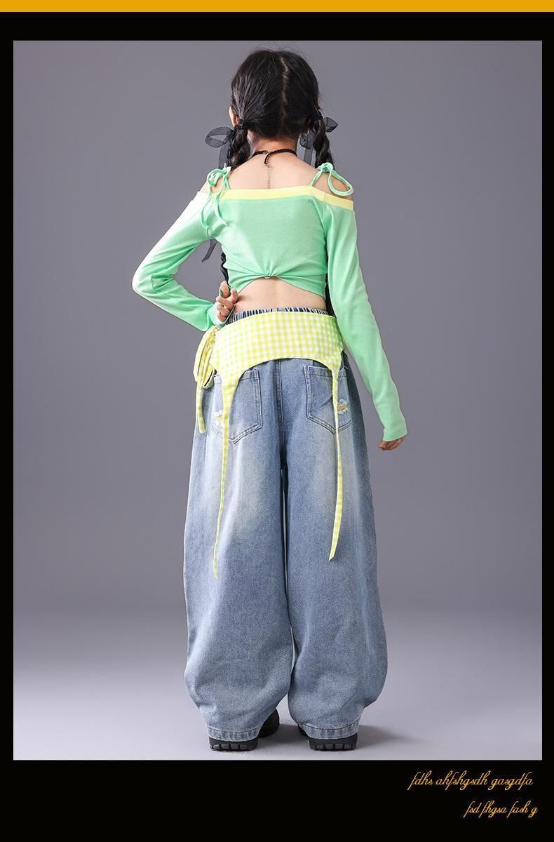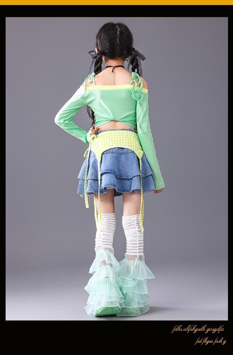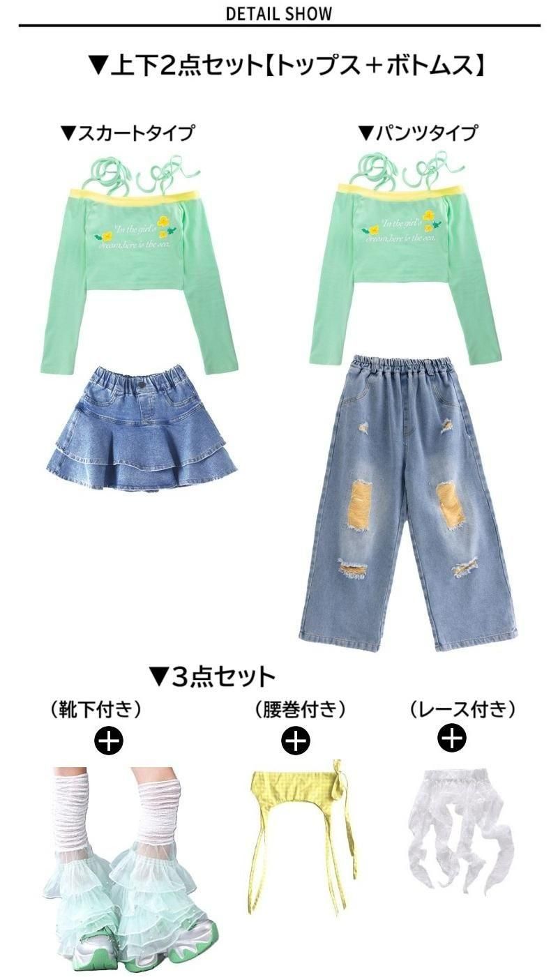 オフショルトップス・デニムスカートorパンツ【グリーン】110-180size